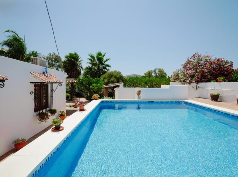 The immaculately presented 8m × 4m swimming pool looks very inviting and there is an outside WC / shower room.