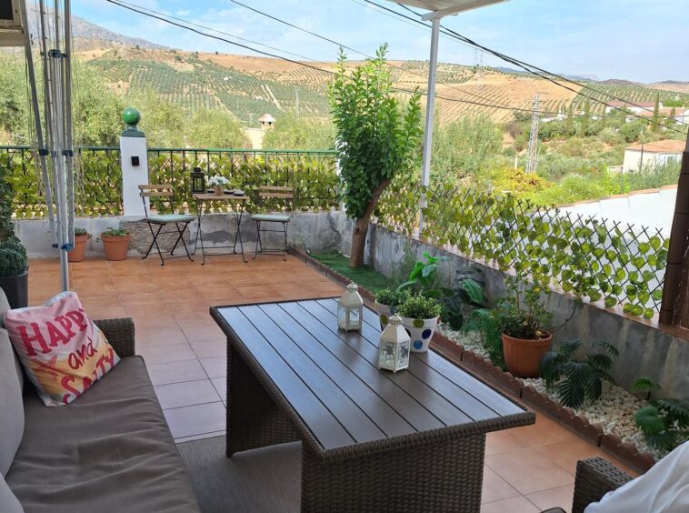 To the front of the property is a lovely terrace, ideal for “ al fresco” dining and hosting fabulous views across the olive groves of the Andalucian countryside as far as La Huma mountain , El Chorro. There is an orange tree and a lemon tree; what could be nicer than freshly squeezed orange juice for breakfast and freshly picked lemons for G & Ts or lemonade while watching the wonderful sunsets which we experience in this part of Southern Spain throughout the year!